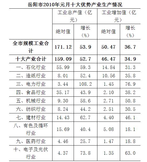 2010年元月份,岳阳工业生产出现开门红,全市1095家规模工业企业完成工业总产值171.12亿元,同比增长53.9%;实现工业增加值50.47亿元,同比增长36.7%,增速比去年同期提升24.2个百分点。