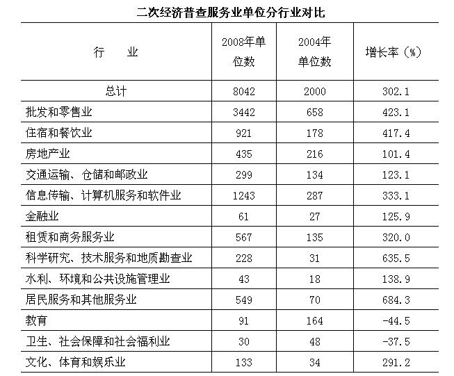 从企业法人单位分行业看,2008年末交通运输、仓储和邮政业法人单位299个,与2004年第一次经济普查相比,增加165个,增长123.1%,年均增长22.2%;批发和零售业法人单位3442个,增长423.1%,年均增长51.2%;房地产业435个,年均增长19.1%:其他服务业法人单位2945个,增加2131个,增长261.8%,年均增长37.9%。