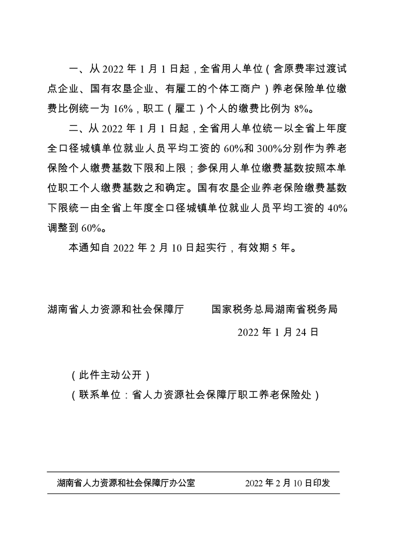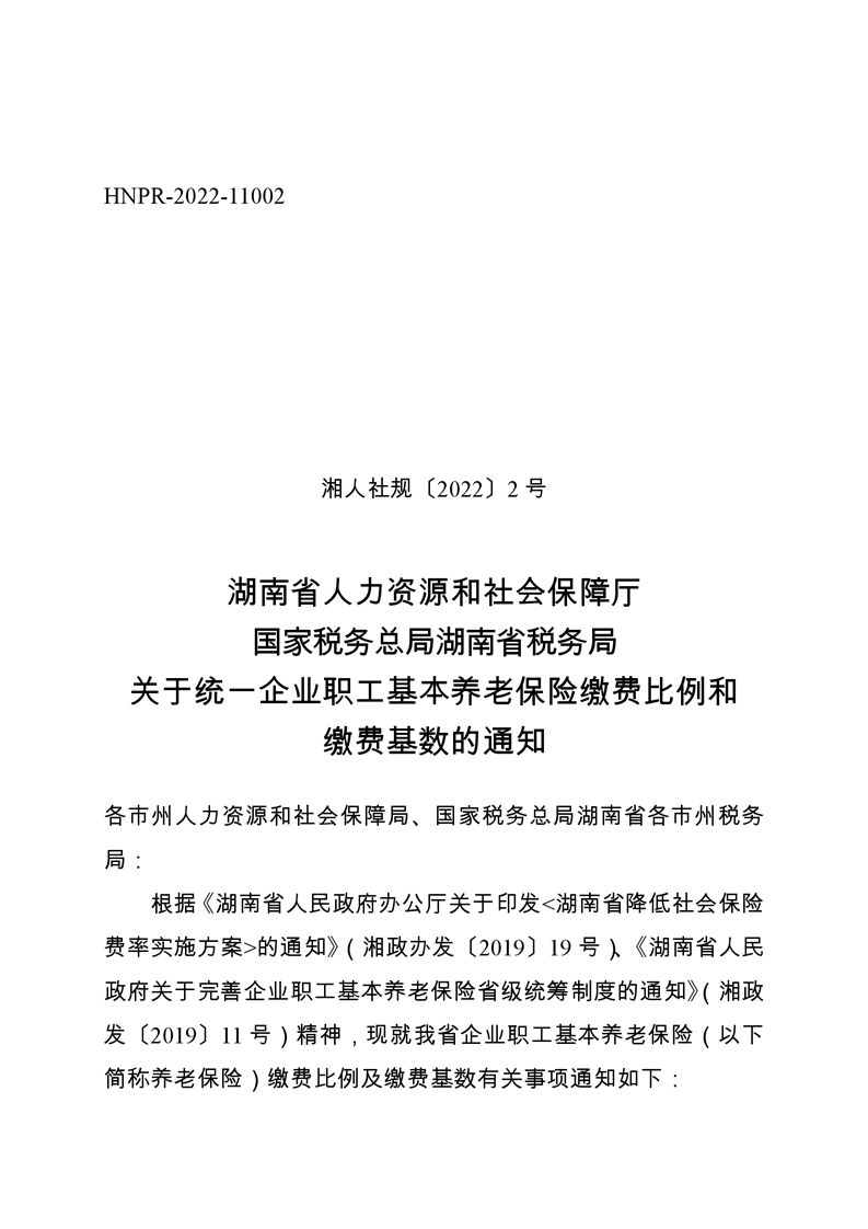 关于统一企业职工基本养老保险缴费比例和缴费基数的通知(湘人社规〔2022〕2号)