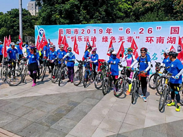6月26日上午,岳阳市在南湖广场开展“6.26”国际禁毒日宣传活动暨“快乐运动 绿色无毒”环南湖自行车友谊赛启动仪式。本次活动由市禁毒委员会主办,市禁毒协会、岳阳楼区禁毒委、岳阳经济技术开发区禁毒委、南湖新区禁毒委承办。出席活动的领导有市委副书记、市长、市禁毒委主任李爱武同志,市委常委、政法委书记、市禁毒委第一副主任王小中同志,市政府副市长、市局局长、市禁毒委副主任唐文发同志,经开区工委书记文春方,市委原常委、市委秘书长,市禁毒协会会长樊进军同志,岳阳楼区区委书记、区禁毒委主任陈阁辉同志,南湖新区工委书记李运帷同志,市政府原党组成员、市长助理,市禁毒协会常务副会长王益民同志,市委政法委常务副书记、市禁毒委副主任胡辉同志,市政府副秘书长、市禁毒委副主任、市禁毒办主任冯嘉皇同志,岳阳楼区区委副书记、区长、区禁毒委常务副主任黄建文同志,市局党委副书记、副局长、市禁毒委副主任王景亮同志。市禁毒委成员单位,市禁毒协会常务理事,骑行志愿者以及来自社会各界的社会团体和热心人士参加本次活动。