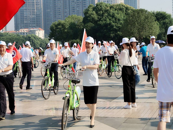 随着自行车比赛的开始,南湖广场上顿时热闹了起来。领导们纷纷骑上自行车,融入了骑行队伍中。骑行志愿者们挥洒着汗水,但脸上洋溢着笑容,队伍旗帜上写着“快乐运动 绿色无毒”。大家拿到骑行纪念证书,留下了深刻的记忆。