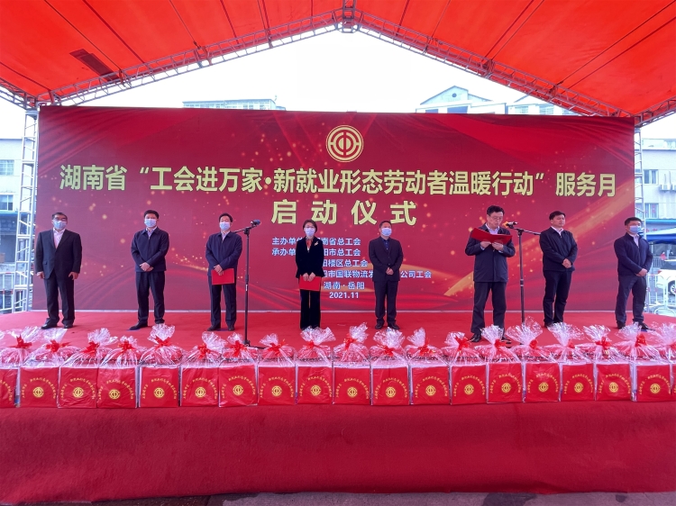 11月5日上午,湖南省“工会进万家·新就业形态劳动者温暖行动”服务月现场启动仪式在岳阳举行。省总工会副主席、党组成员傅筝,省邮政管理局党组成员、纪检组长、副局长胡荣满出席,市委副书记、市委政法委书记李挚致辞,市人大常委会党组副书记、副主任、市总工会主席彭先政主持,市总工会党组书记、副主席提名人选彭公穆,市邮政管理局党组书记、局长殷宏亮等参加。外卖配送员、网约车司机、货车司机等新就业形态代表及相关企业工会负责人参与活动。