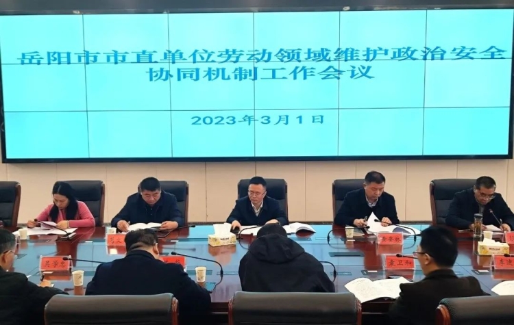 2023年3月1日,岳阳市市直单位劳动领域维护政治安全协同机制工作会议召开。市委国安办、市委政法委、市委网信办、市总工会、市教体局、市公安局、市民政局、市人社局、市商务局、市市场监督管理局、市国安局、军分区政治部等12个相关部门参加会议。市人大常委会副主任、市总工会主席喻文出席会议并讲话,市委国安办专职副主任、市委副秘书长黄要林主持会议。