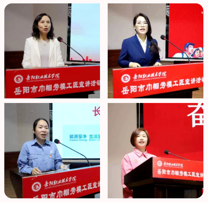 第十三、十四届全国人大代表、全国五一劳动奖章、全国医德标兵、湖南省先进工作者,岳阳市人民医院门诊部主任兼任医院第七党支部书记胡春莲围绕《用奉献书写责任与担当》为主题,全国劳动模范、湖南国泰食品有限公司党支部副书记、原料基地负责人刘玉婷围绕《劳动创造幸福 奋斗成就梦想》为主题,湖南省劳动模范、长岭炼化公司信息管理专家许会芳围绕《初心不忘 使命不怠 做新时代最美奋斗者》为主题,湖南省劳动模范、汨罗市爱心天使助残服务中心理事长、岳阳市忠美职业技术学校校长杜忠美围绕《爱心助残,共拥一片蓝天》为主题,与600多名师生分享了自己从普通女职工成长为行业楷模的心路和故事,展示了巾帼力量,诠释了劳模精神、劳动精神、工匠精神。