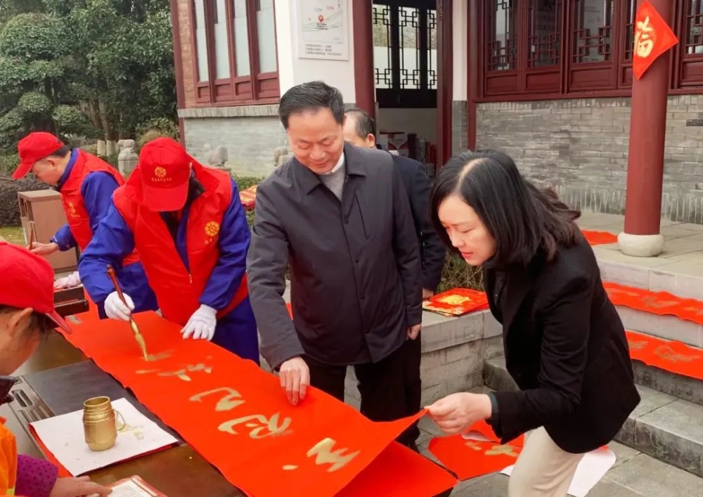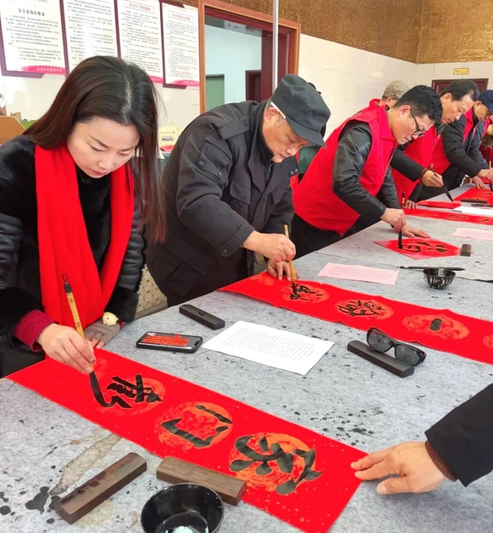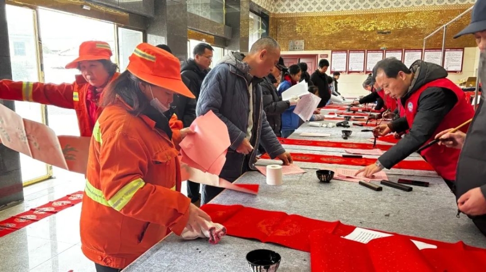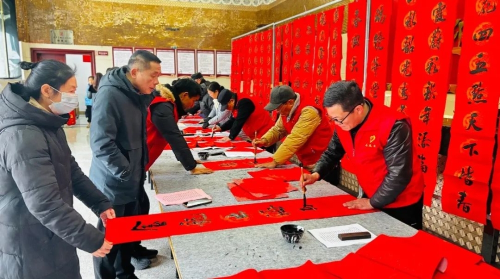撰百联、书千联、送万福。本次活动共组织20名书法家,现场写赠春联、福字千余幅,免费送给社区居民、环卫工人、快递小哥、城市建设者、先进工作者,将关怀送去千家万户,为群众增添了节日的喜庆色彩,弘扬了向上向善的道德风尚,以文艺的方式丰富了群众的精神文化生活。