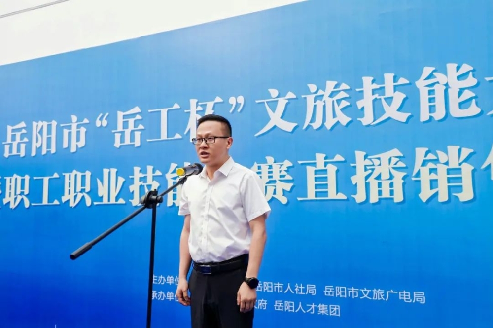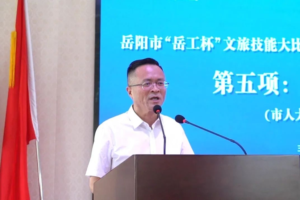 ▲4月18日,岳阳市人社局党组书记、局长黄达江出席文旅导游讲解员决赛开幕式并致辞。