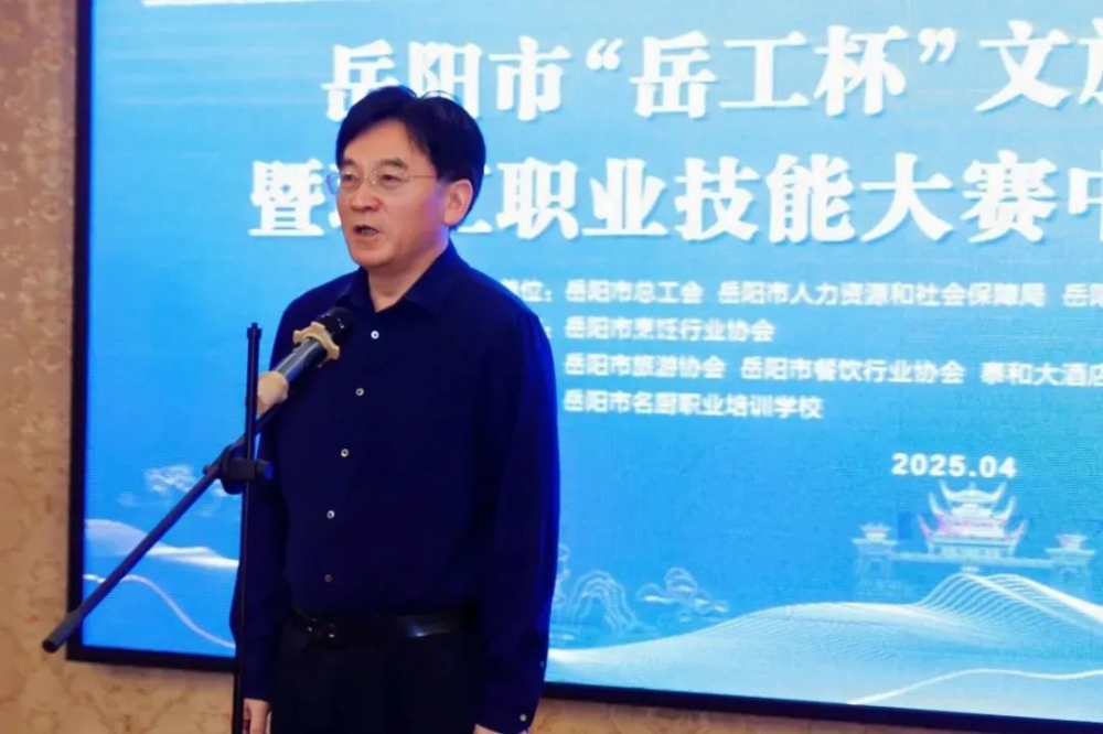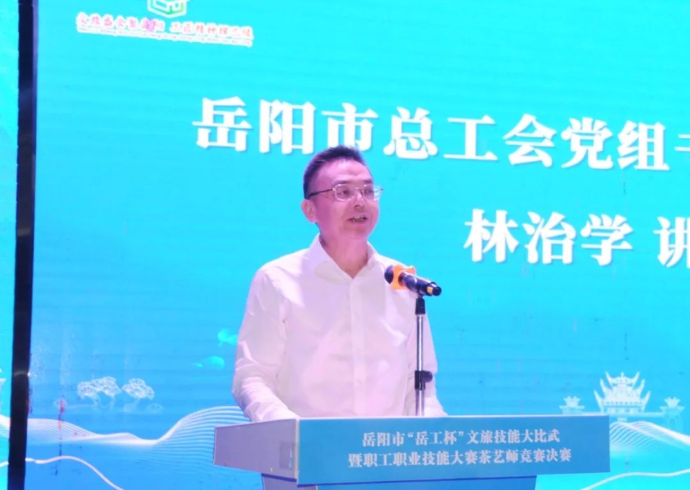▲4月17日、18日,岳阳市总工会党组书记、副主席林治学出席中式烹调师、茶艺师、酒店服务员决赛开幕式并致辞。
