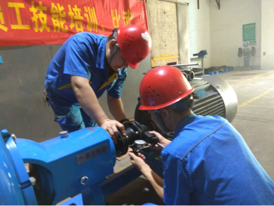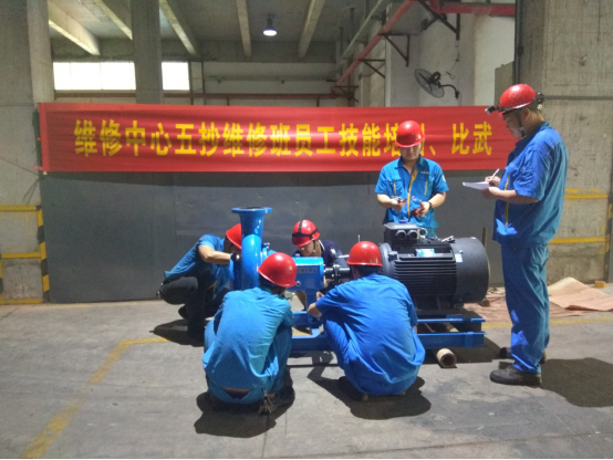 今年上半年,该班班长谢吉良荣获了湖南省实体经济企业100名优秀班组长荣誉后,组织全体班员每周利用空余时间进行百分表找正技能培训,有理论知识的现场讨论也有百分表找正技术的现场实操。在班组比、学、赶、超的氛围影响下,全体班员提升专业技能的热情高涨。这次的百分表找正45KW的安德里茨泵技能比武是对班组培训成果的一次检验,也是班组工匠技艺高下的一次展示。