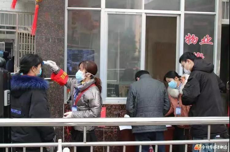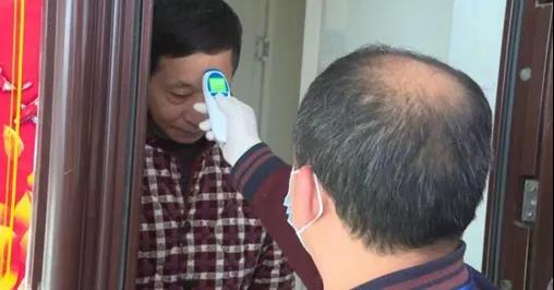 (▼王丽华同志在万丽花园为进出群众测量体温、核查返乡人员)