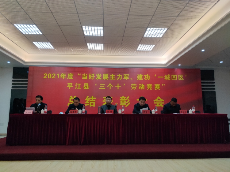 近日,由平江县总工会、湖南平江高新技术产业园区等单位主办的“当好发展主力军、建功‘一城四区’平江县‘三个十’劳动竞赛”总结表彰大会举行。岳阳市总工会党组成员、副主席谢专一,平江县委副书记胡伟,平江县委常委、县委办主任、县总工会主席彭喜丰,湖南平江高新技术产业园区管委会主任罗江伯,以及平江县总工会、平江县发改局、平江县科工局等单位主要负责人,相关企业负责人,受表彰单位和个人,共计近100人参加会议。