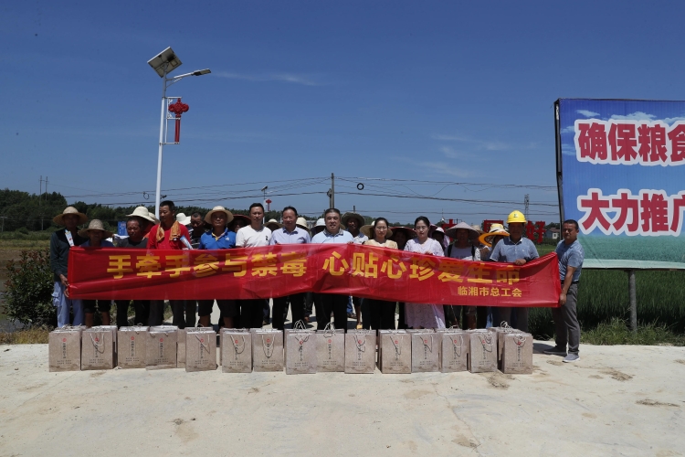 7月13日上午,临湘市总工会全体班子成员冒着酷暑到聂市镇召丰水稻种植基地,为正在田间劳作的农户们送去清凉物资,并积极开展禁毒宣传,在田间地头奏响晚耕禁毒交响乐。