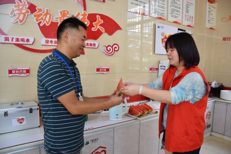 “以前我们想找个阴凉的地方喝水都不容易,现在工会给我们建了个‘家’,累了渴了,就可以回‘家’喝水休息。”罗上中说自己乐意来这里休息,服务氛围特别好,跟在自己家一样自在。
