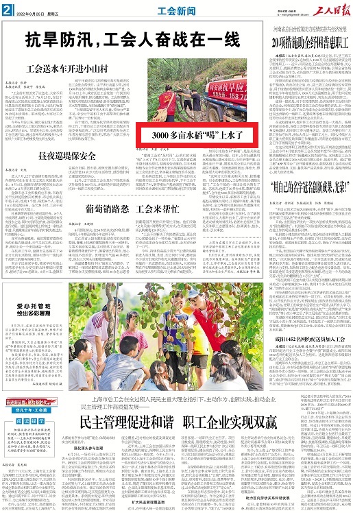 《工人日报》8月26日以《3000多亩水稻“喝”上水了》为题,报道了临湘市总工会抗旱保收、服务劳模作。