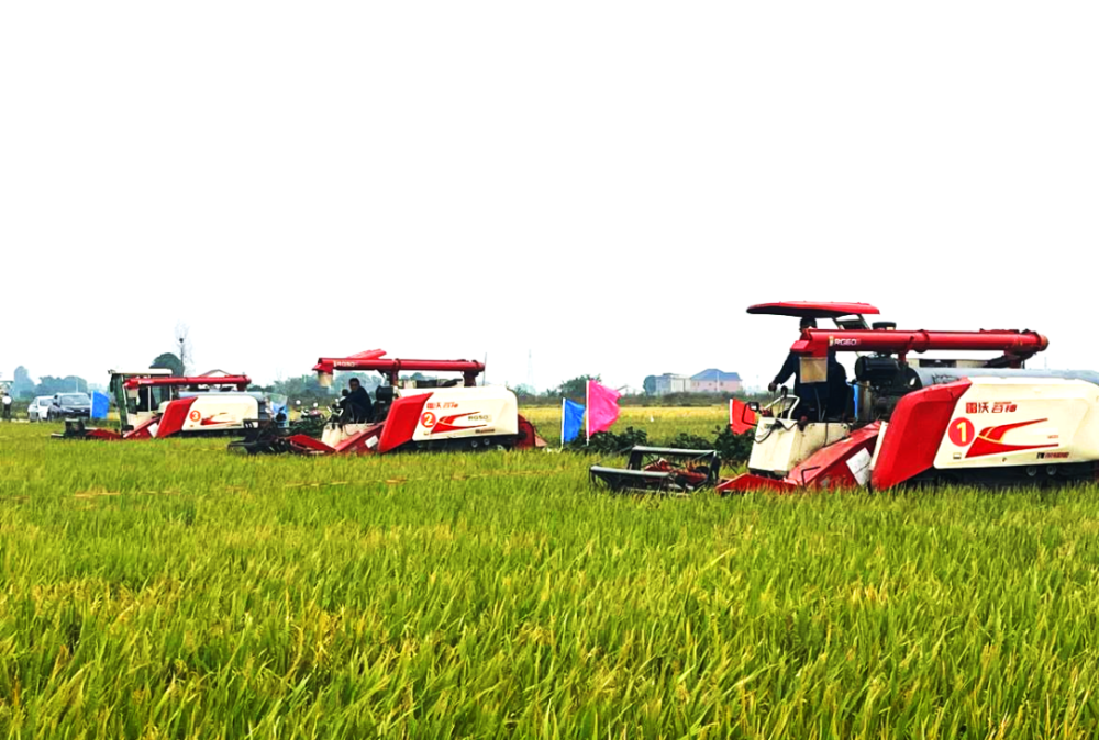 不远处轰隆隆的联合收割机也开始了大比武活动,六台同型号的收割机一字排开,6名农机手经过一番调试、适应后依次下田,驾驶着收割机在规定的地块里来回穿梭,在稻田里“画”出“丰收的图案”,庆祝着丰收的喜悦,赛出各自的驾驶技术水平。此次收割机劳动技能大比武活动旨在带动提高广大农机手的操作技能,加快机收减损技术推广普及。