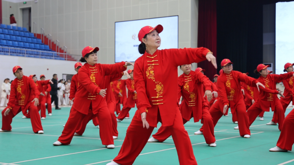 展演现场,来自全县党政机关、企事业单位、乡镇、学校、社区等部门单位组建的30支太极队1000多名太极拳爱好者齐聚一堂,共同展示太极拳的独特魅力。各代表队身着统一服装,精神抖擞依次登场,通过精湛的技艺和优美的动作,为观众带来了36式陈氏太极拳、24式杨氏太极拳、柔力球、游龙拳、综合太极拳、32式太极剑等多个精彩节目。整个展演过程不仅展示了太极拳的刚柔并济、动静结合的特点,还融入了扇、伞、剑等多种元素,使得太极拳的表现形式更加丰富多彩,让在场观演人员无不拍手叫好。