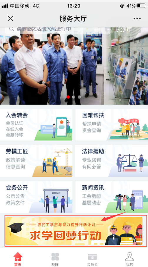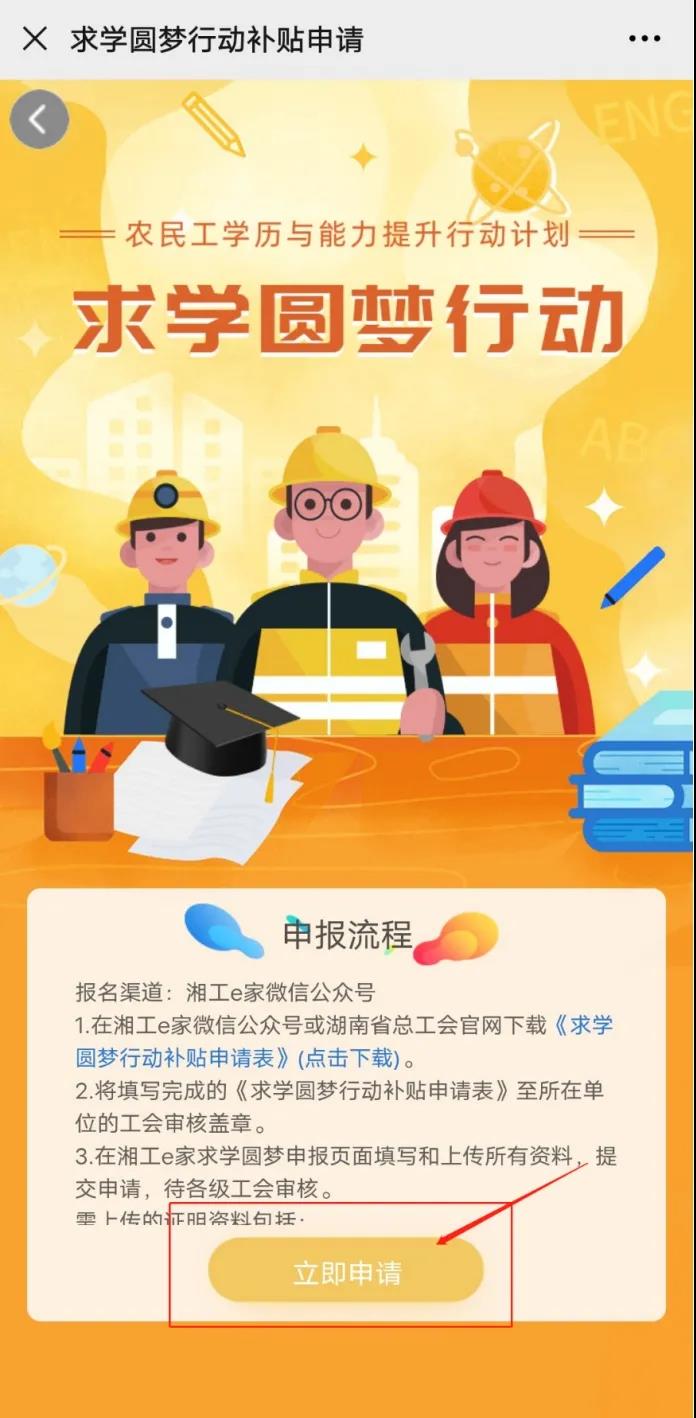 1.符合条件的农民工本人关注“湘工e家”微信公众号,进入“服务大厅”,点击“求学圆梦”栏目进行申报。