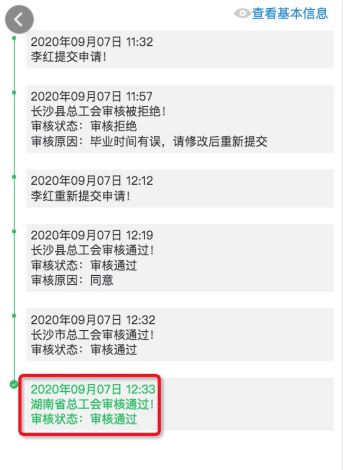 5. 等待审核结果。如审核未通过,将通过短信提醒申请人,申请人可在申报页面进行修改再次提交。 提交申请的农民工本人可通过“湘工e家”申请页面实时查看申请审批进度。