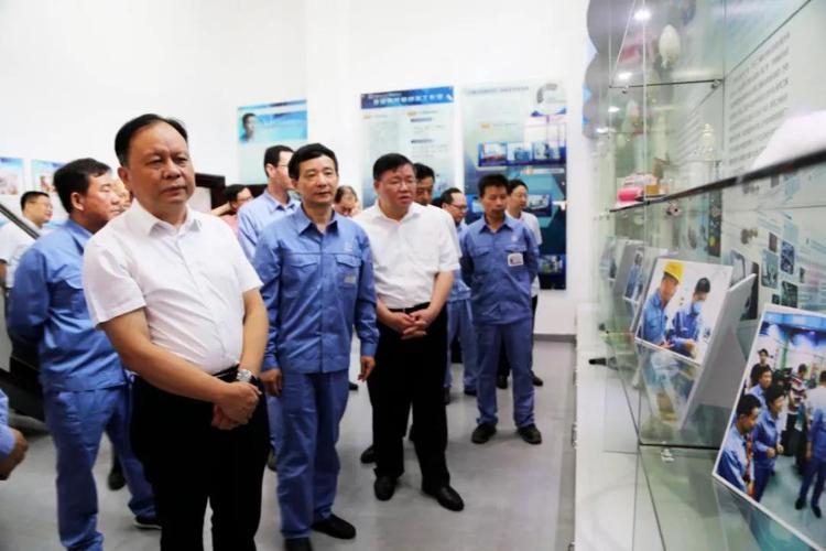 ▲在巴陵石化橡胶部劳模创新工作室,周农一行仔细查看劳模和职工创新成果。