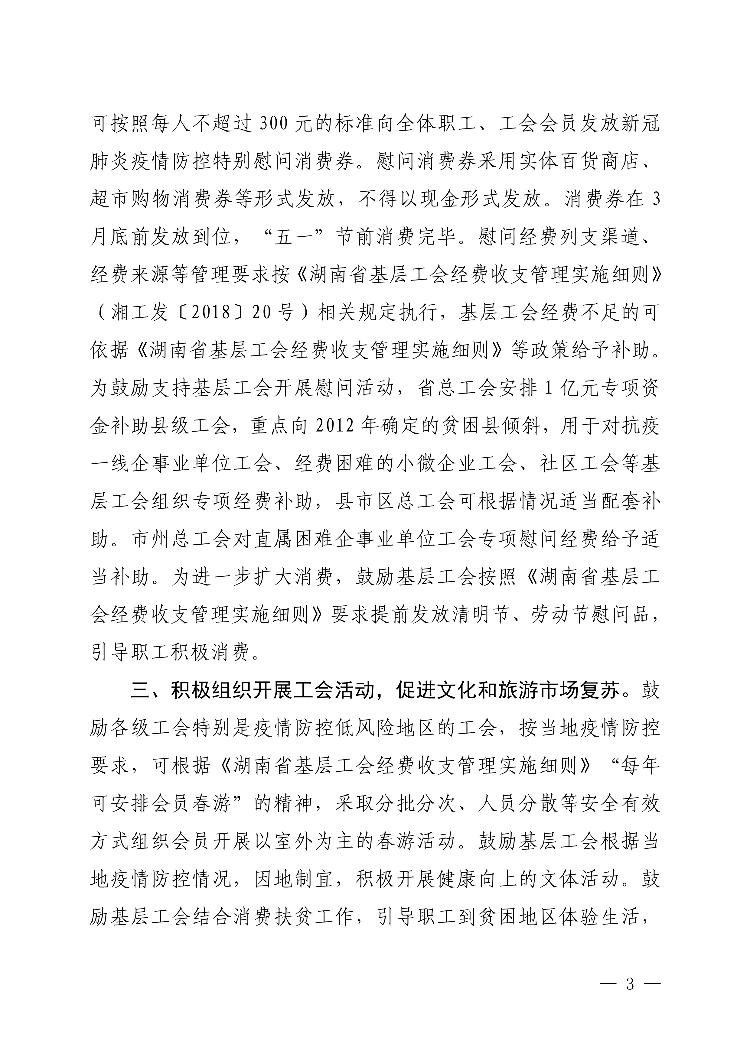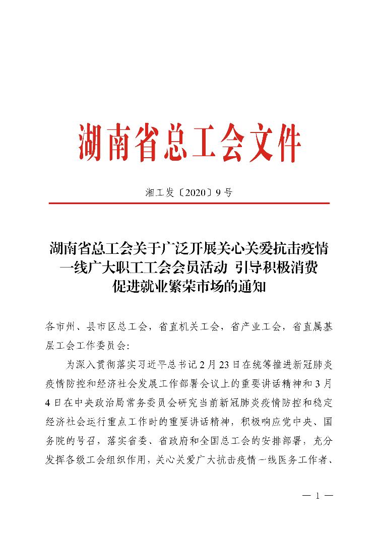 湖南省总工会关于广泛开展关心关爱抗击疫情一线广大职工工会会员活动 引导积极消费 促进就业繁荣市场的通知