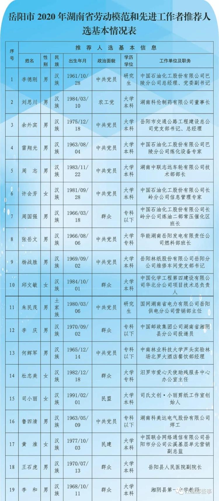 根据2020年湖南省全国、全省劳动模范和先进工作者推荐评选委员会办公室通知要求,为贯彻公开、公平、公正原则,广泛听取群众意见,现将岳阳市2020年湖南省劳动模范和先进工作者推荐人选基本情况予以公示。公示期间,如对推荐人选有异议的,可以信函、电话、传真等方式向岳阳市劳动模范管理工作领导小组办公室反映。反映问题须实事求是,客观公正,为便于了解情况,请举报人签署或告知本人真实姓名、工作单位和联系方式等。