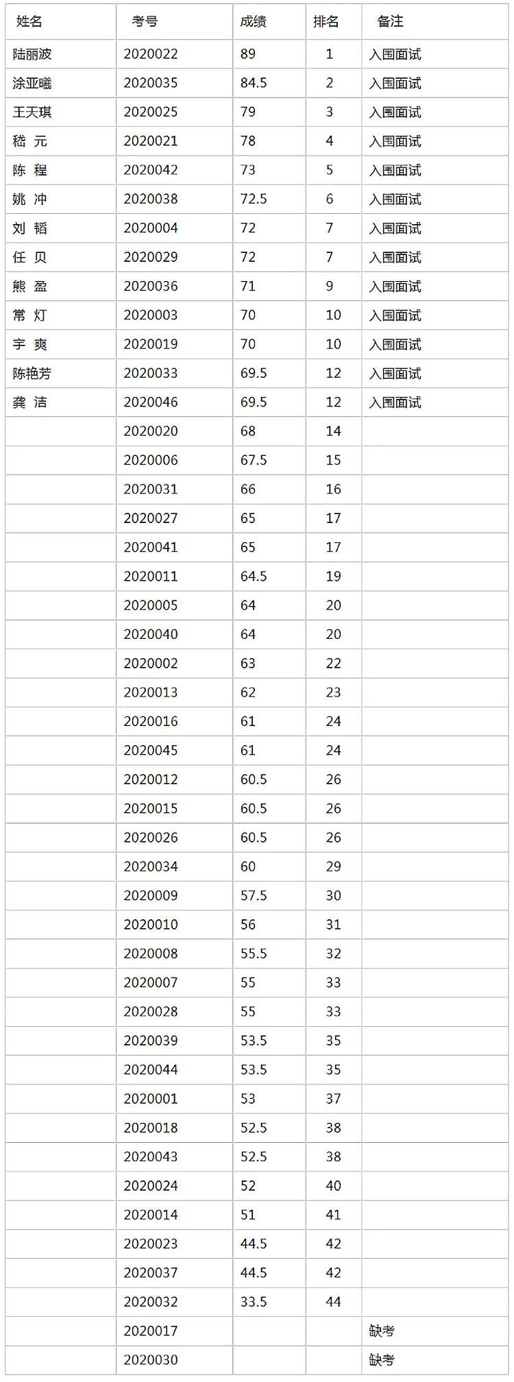 招聘笔试(机试)成绩公示