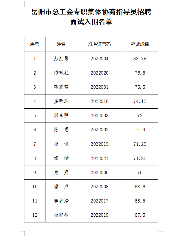 岳阳市总工会专职集体协商指导员招聘笔试工作已于2022年8月28日结束,根据《岳阳市总工会专职集体协商指导员招聘公告》规定,按照笔试成绩排名,现将面试入围人员名单公告如下。