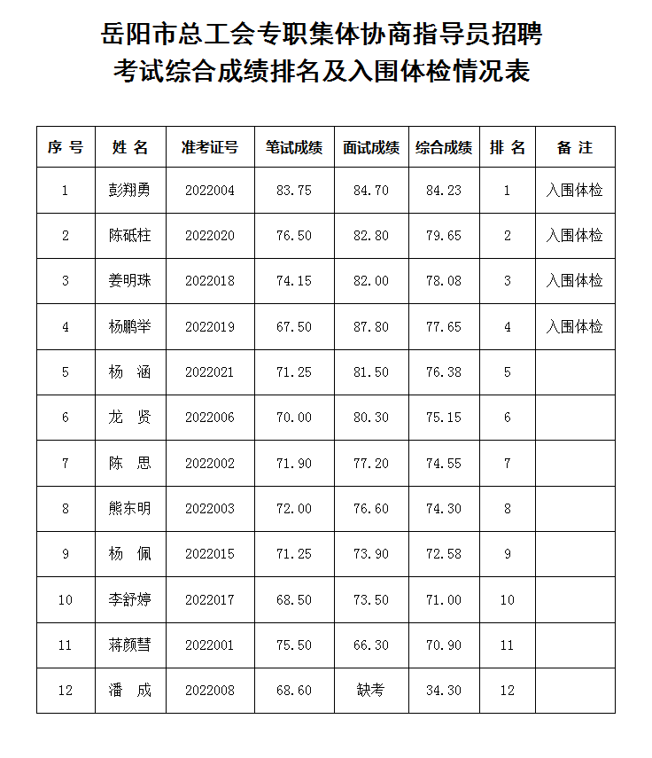 岳阳市总工会专职集体协商指导员招聘面试工作已经于2022年9月4日结束。根据《岳阳市总工会专职集体协商指导员招聘公告》规定,按照笔试、面试成绩分别占50%的比例确定综合成绩,并按综合成绩前4名确定体检对象。如有放弃,按考生综合成绩排名依次递补。现予以公布。