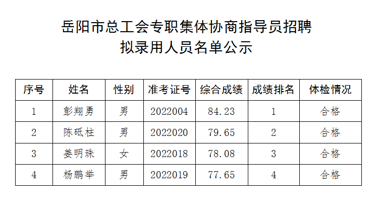 岳阳市总工会专职集体协商指导员招聘,经报名、资格初审、笔试、面试、体检、资格复审等程序,按照《岳阳市总工会专职集体协商指导员招聘公告》规定,现将以下4名拟录用人员予以公示,公示时间为2022年9月19日至9月23日,共5个工作日。