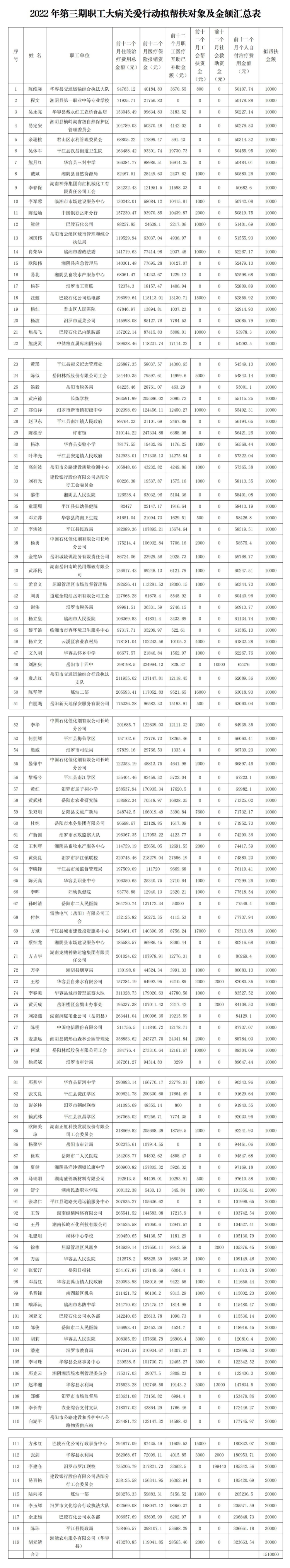 为进一步关心关爱因重大疾病致困职工群众,扎实做好防困济困工作,根据湖南省总工会《关于开展第三期职工大病关爱行动的通知》(湘工办函〔2022〕28号)文件要求,通过各基层工会申报,岳阳市职工医疗互助会核实,共收到符合条件的帮扶对象119名,现对第三期职工大病关爱行动拟帮扶对象及金额汇总表予以公示: