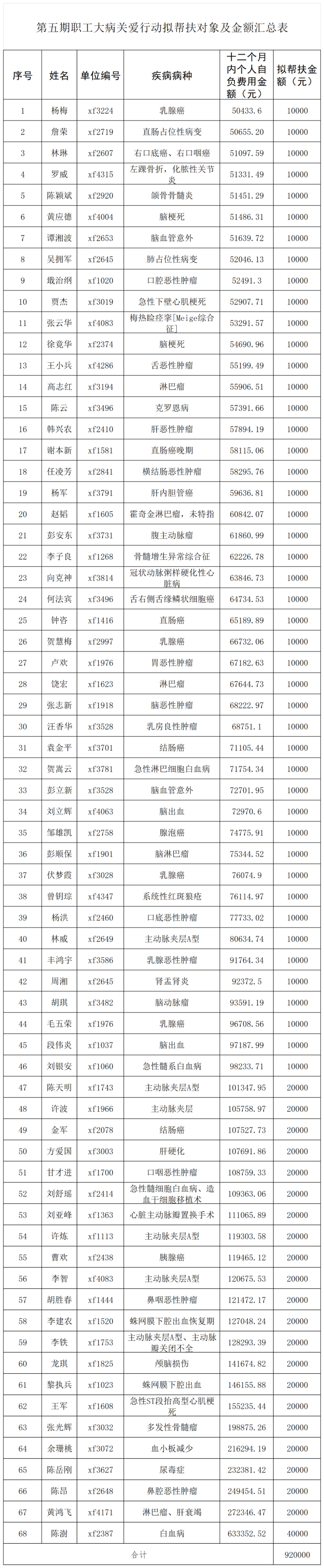第五期职工大病关爱行动拟帮扶对象及金额公示