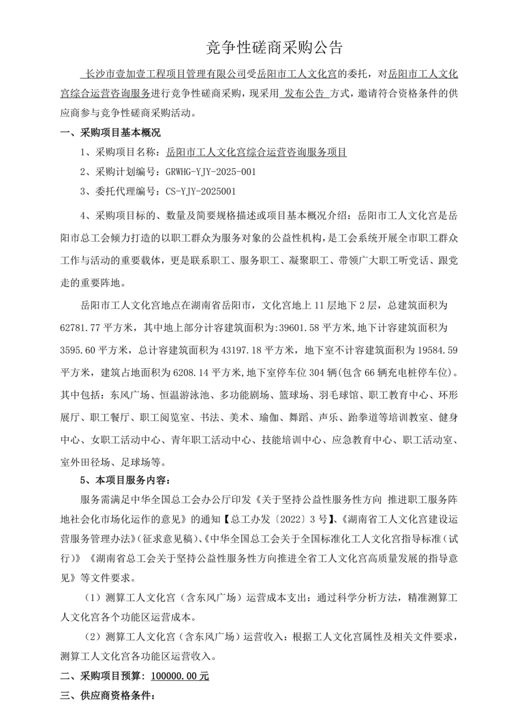 岳阳市工人文化宫综合运营咨询服务项目竞争性磋商采购公告