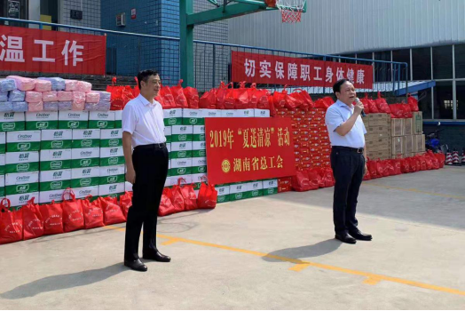 7月23日,省人大常委会副主任、省总工会主席周农,省总工会副主席李铁华等一行深入岳阳企业一线,为高温下的劳动者送清凉、送关爱。市人大常委会副主任、省总工会主席彭先政,市总工会党组成员、副主席谢专一一同前往。
