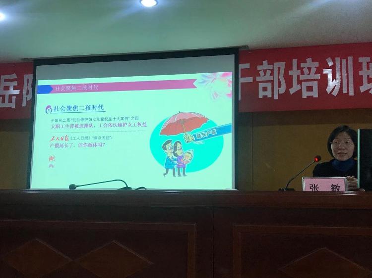 11月28日,培训班邀请湖南省总女工部部长张敏莅临指导,课上张敏从三个方面开展女工部干部工作培训:当前工会女职工面临的形势、我省工会女职工工作定位与主要内容以及对基层工会女职工工作的思考。