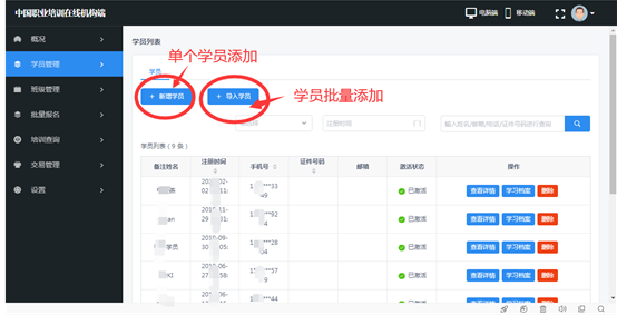 添加学员:在“学员管理”中可以批量导入学员信息。