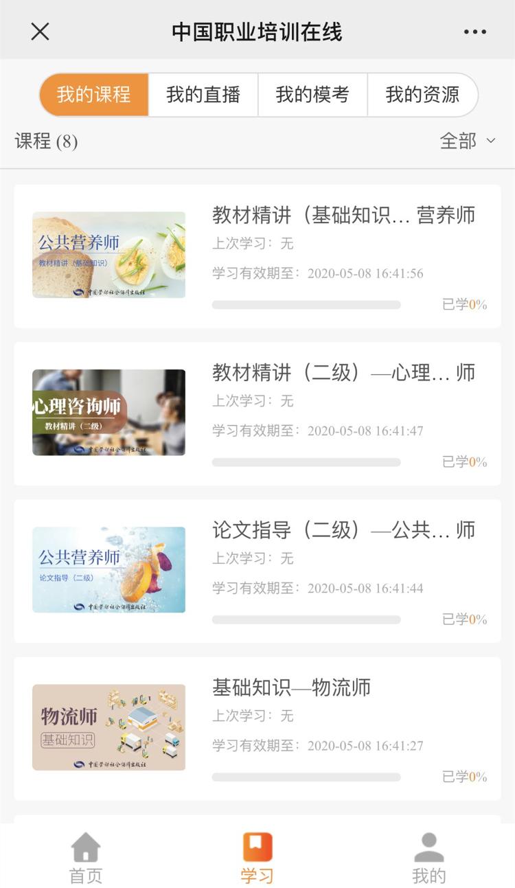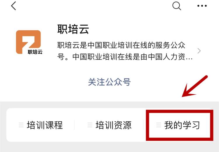 关注“职培云”公众号,点击公众号底部“我的学习”→“我的课程”进入培训平台微信端首页,点击底部导航“我的”或“学习”,注册并登录,在“我的课程”菜单查看课程并学习。