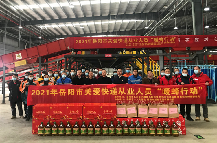 2月5日,市总工会、共青团岳阳市委、市交通运输局、岳阳市邮政管理局联合举办关爱快递从业人员“暖蜂行动”慰问活动,为快递人员送上爱心防疫包、防寒服、食品等慰问物资。