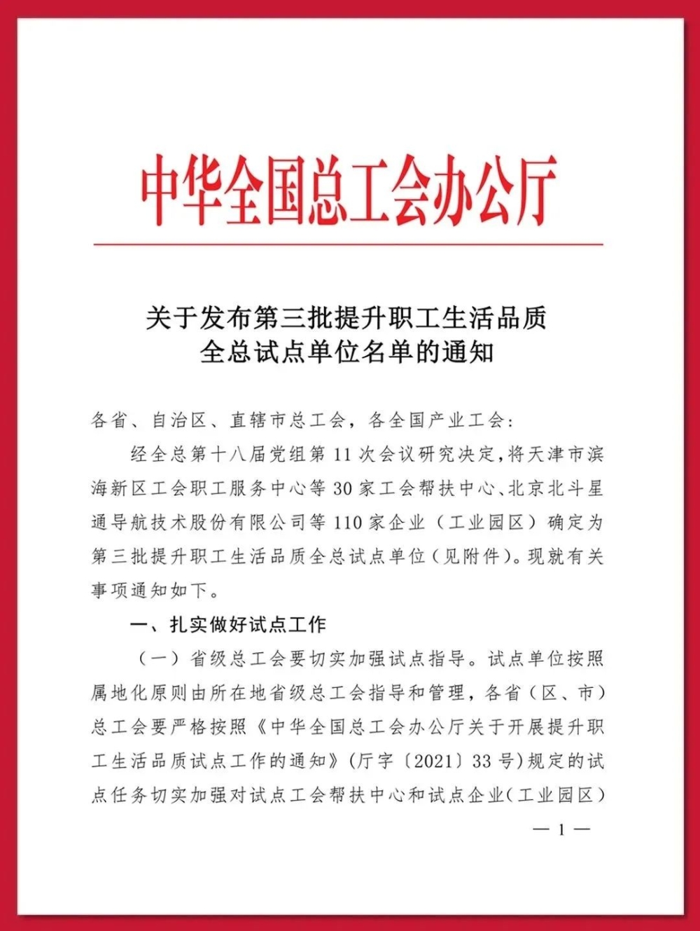 近日,全国总工会下发《关于发布第三批提升职工生活品质全总试点单位名单的通知》(以下简称《通知》),确定了30 家工会帮扶中心、 110 家企业(工业园区)为第三批提升职工生活品质全总试点单位。