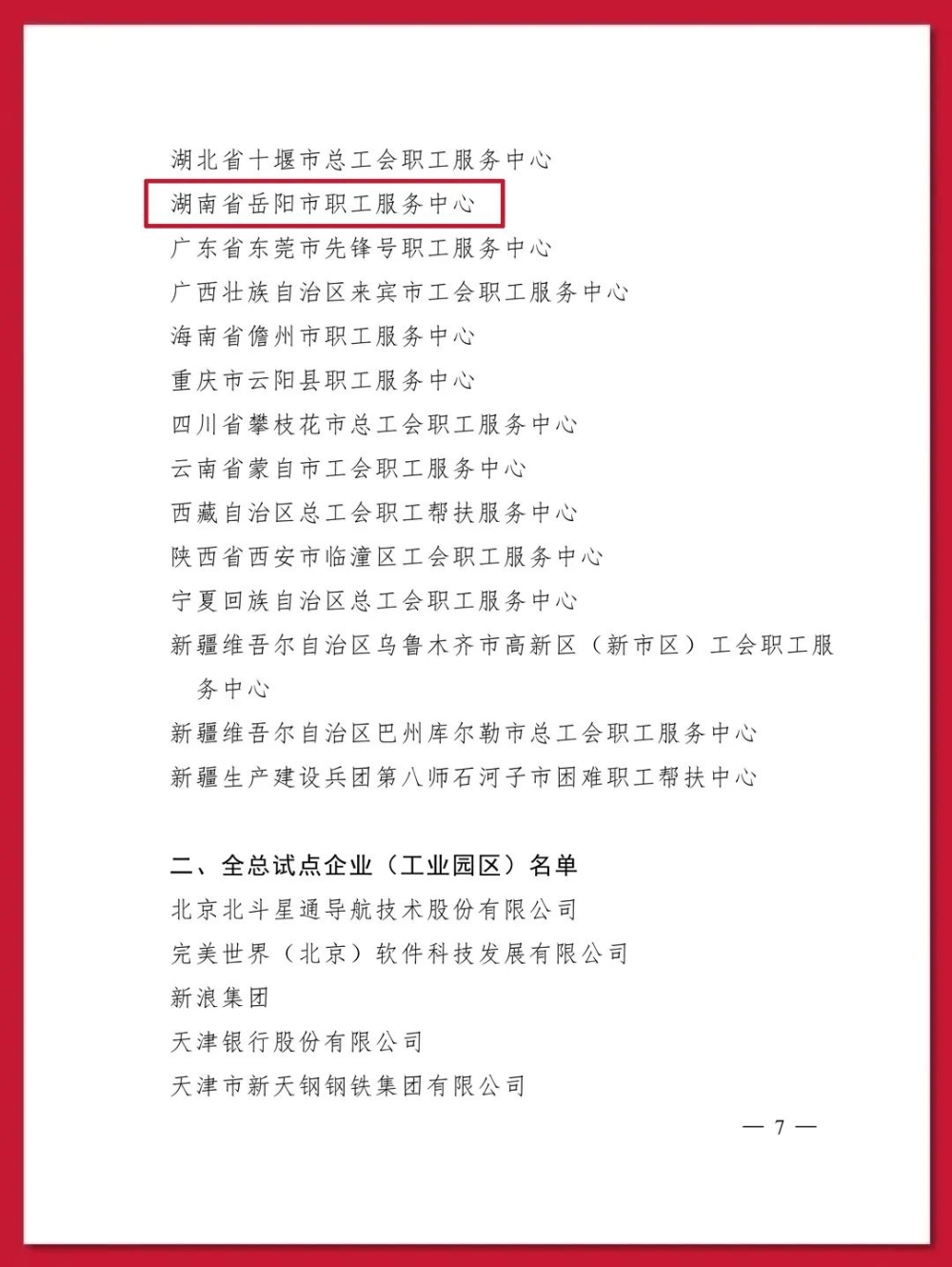 岳阳市有两家单位入选,分别是岳阳市职工服务中心和远大可建科技有限公司,占据湖南省入选试点工作的四家单位中的两席,其中,岳阳市职工服务中心是湖南省唯一一家入选的职工服务中心,这表明岳阳在提升职工生活品质工作方面迈上新的台阶。