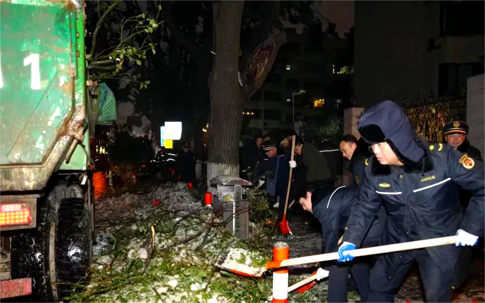 ▲岳阳楼区园林绿化中心和属地办事处机关干部在德胜路市医保局路段除冰清障。
