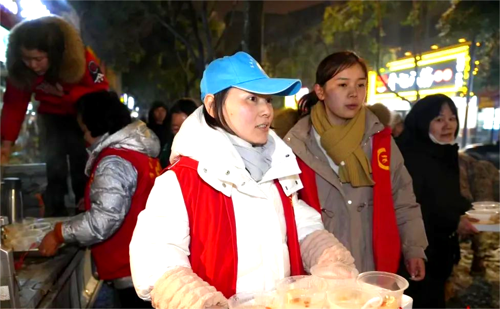▲工会志愿者为一线作业人员送上热饮。