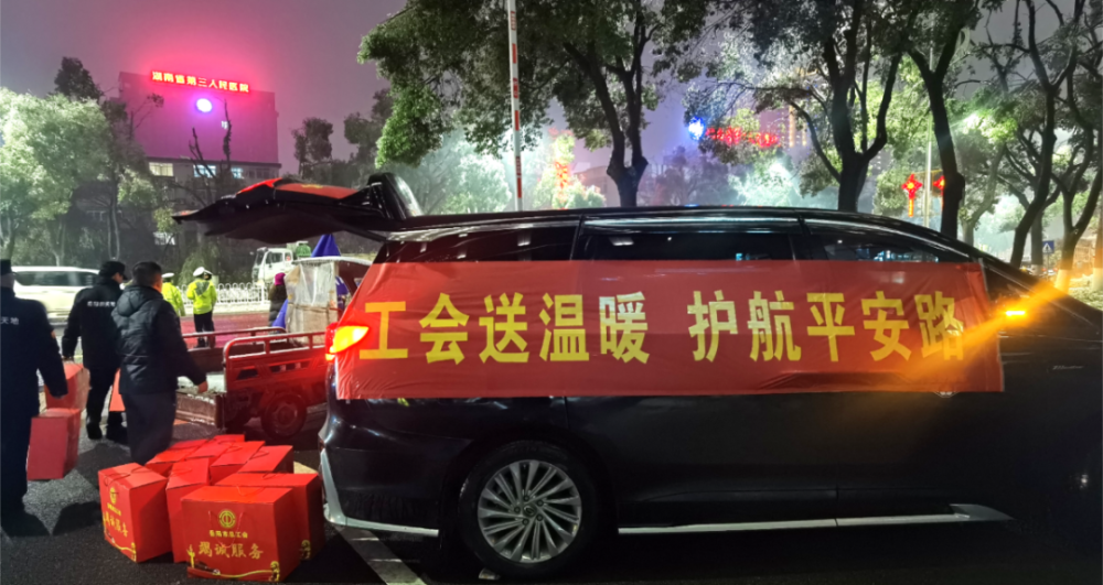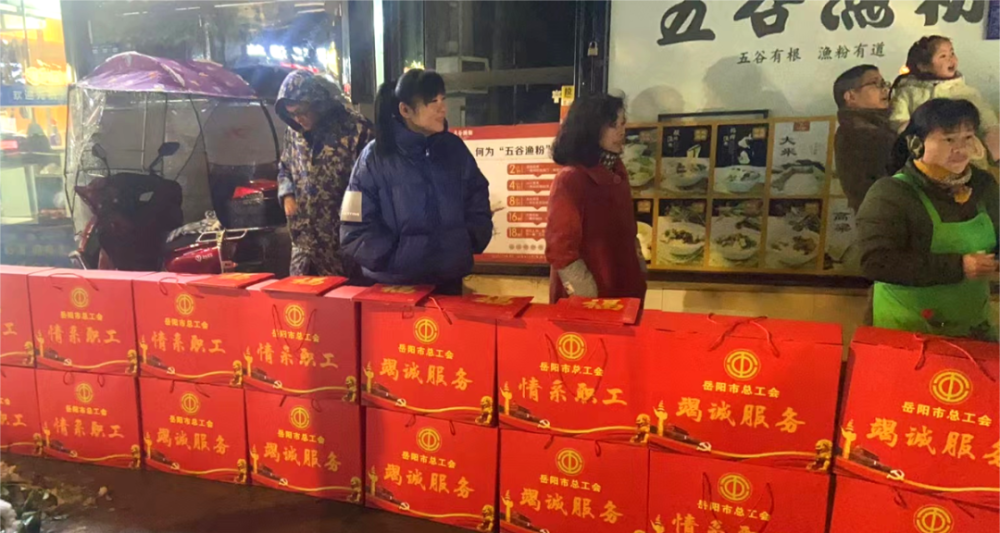 ▲岳阳市总工会为除冰清障的一线职工送上温暖关怀慰问食品。