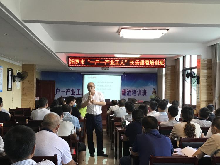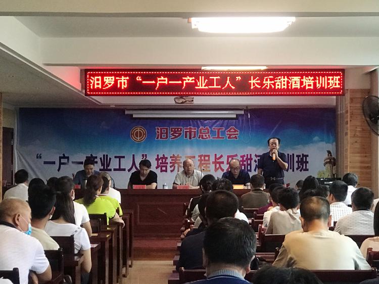 7月7日,由汨罗市总工会举办的“一户一产业工人”长乐甜酒培训班在长乐镇大垅农庄开班。来自汨罗市的百余名学员将在为期6天的培训中,与湖南理工学院教授、巴陵工匠一起学习。“一户一产业工人”培养工程,是省总工会、市总工会的一项重大民生工程、惠民工程,也是为了促进农民工更好的就业和脱贫致富的重要举措。