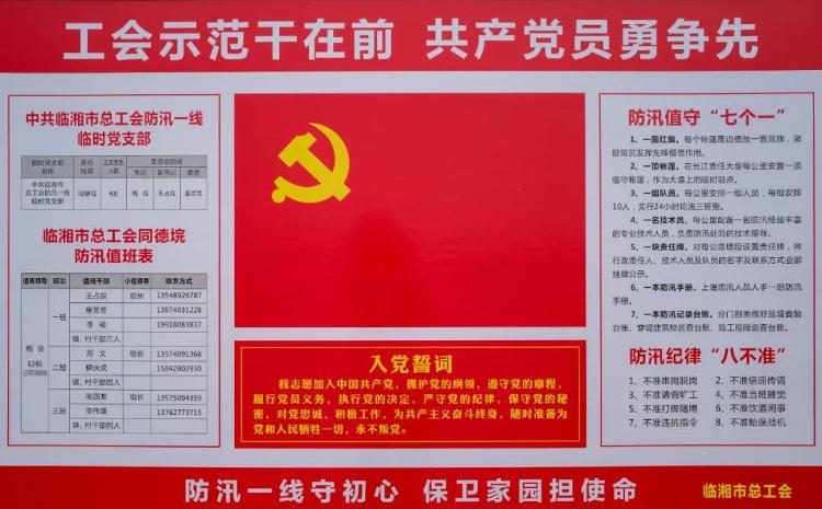 惊涛骇浪脚下踩,鲜艳党旗大堤扬。7月17日上午,防汛一线全体值守队员由梅良同志领誓,在鲜红的党旗下宣誓和誓师,切实发挥党组织战斗堡垒作用、共产党员的先锋模范作用以及工人阶级的主人翁精神,坚决打赢黄盖湖内垸堤防保卫战。