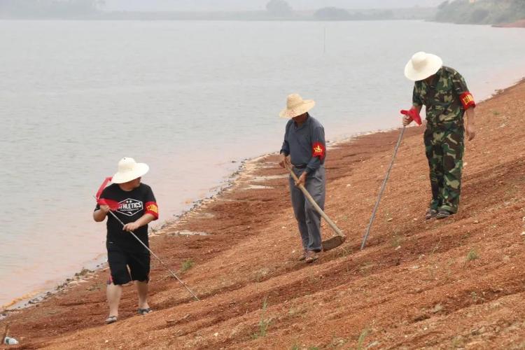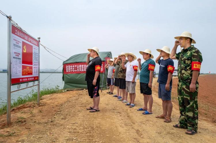 ▲临湘市总工会全体值守人员誓师保卫黄盖湖内垸堤防