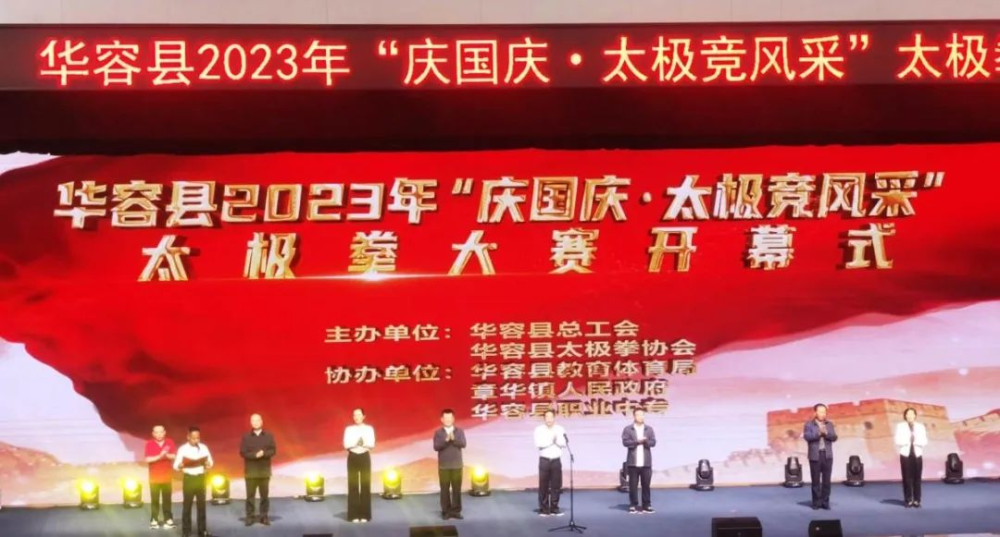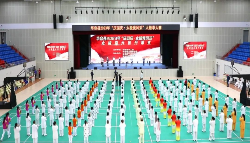9月24日,华容县2023年“庆国庆·太极竞风采”太极拳大赛在华容县职业中专体育馆隆重举行。本次大赛由华容县总工会、县太极拳协会主办,县教育体育局、县职业中专、章华镇人民政府协办,旨在发动全县各级工会会员广泛开展全民健身运动,加速推进“健康华容”建设工程,赛出太极拳运动风采,庆祝新中国成立74周年。华容县委书记陶伟军宣布大赛开幕,华容县委常委、县委办主任、县总工会主席胡军主持开幕式,华容县委常委、副县长涂娟致辞,华容县人大常委会主任李学松,县政协主席张大宏,县人大常委会副主任张昭林、副县长陈飞、县政协副主席文丽萍等出席。