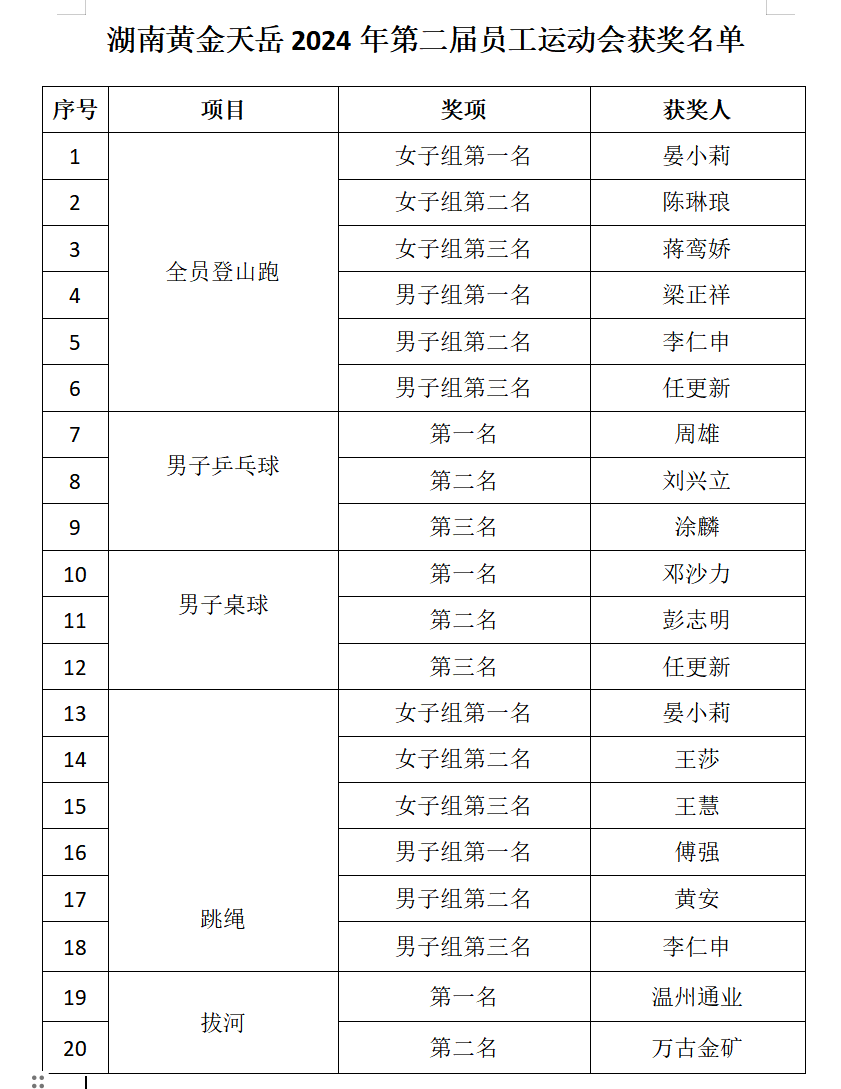 本届员工运动会以“斗志昂扬、放飞梦想”为主题,分为六大项目,包括全员登山跑、篮球赛、乒乓球赛、桌球赛、跳绳、拔河等。运动会期间,各参赛队员都表现出了良好的道德风尚和竞技能力,赛出了风格,赛出了水平,赛出了湖南黄金天岳人的精气神。
