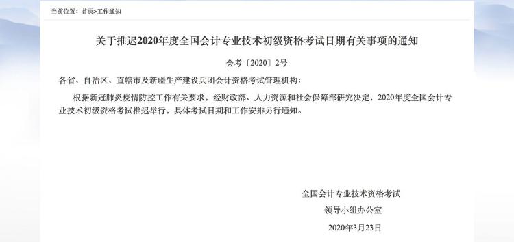 ▶会计专业技术初级资格考试推迟举行2020年度全国会计专业技术初级资格考试推迟举行!具体考试日期和工作安排另行通知!