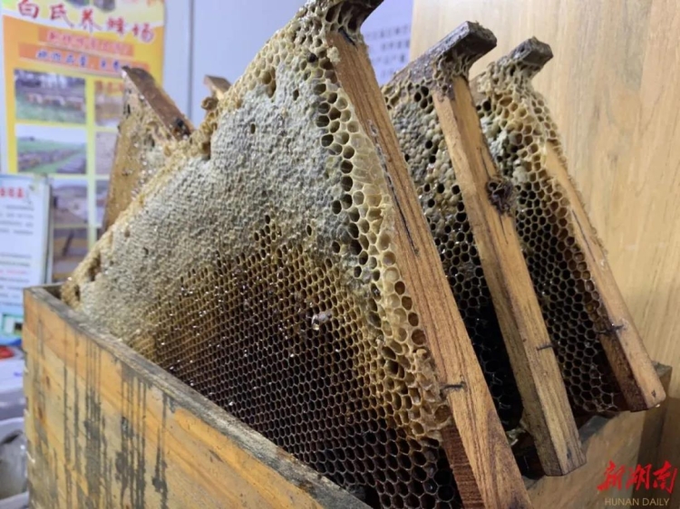 蝶恋花养殖农民专业合作社的摊位前,蜂蜜、蜂花粉、蜂王浆等10多个品种的蜂产品精心摆放。其中要数老巢蜜最为火爆,吸引了一波接一波食客。工作人员热情邀请大家每人尝上一大口:“就这样嚼着吃,很好吃的,没有比蜜更甜的了。”