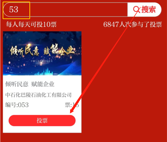3.搜索第53号作品→《倾听民意 赋能企业》,点击“投票”即可。(每个微信用户每天可为10个不同作品各投票一次。)