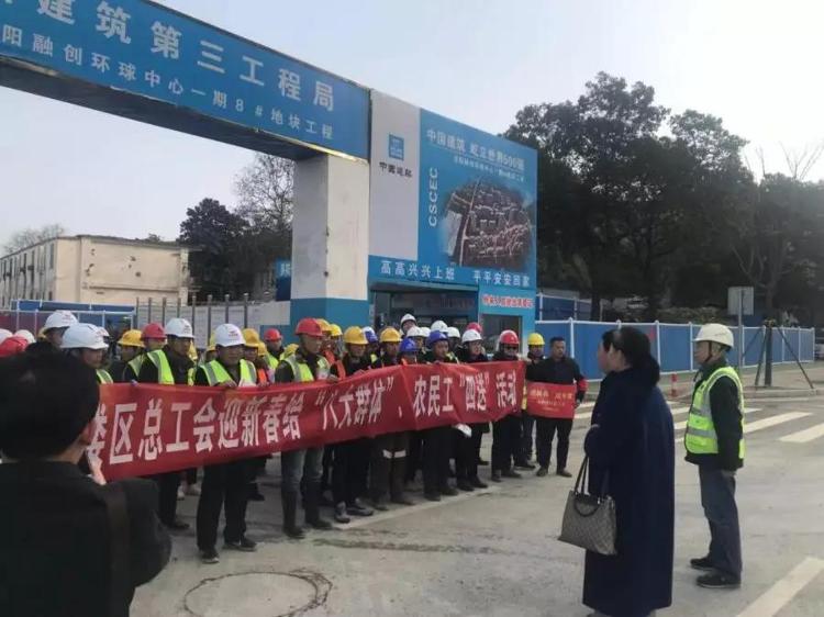 近日,岳阳楼区总工会组织全体工作人员到重点项目建设工地(融创环球中心)给一线职工送年货、返乡车票和宣讲安全生产知识,到物业公司给保安员送防寒保暖用品,到快递公司给快递小哥送防寒保暖用品,还给其他行业职工送去3000份春联和福字。祝福广大职工度过一个欢乐祥和的新春佳节。
